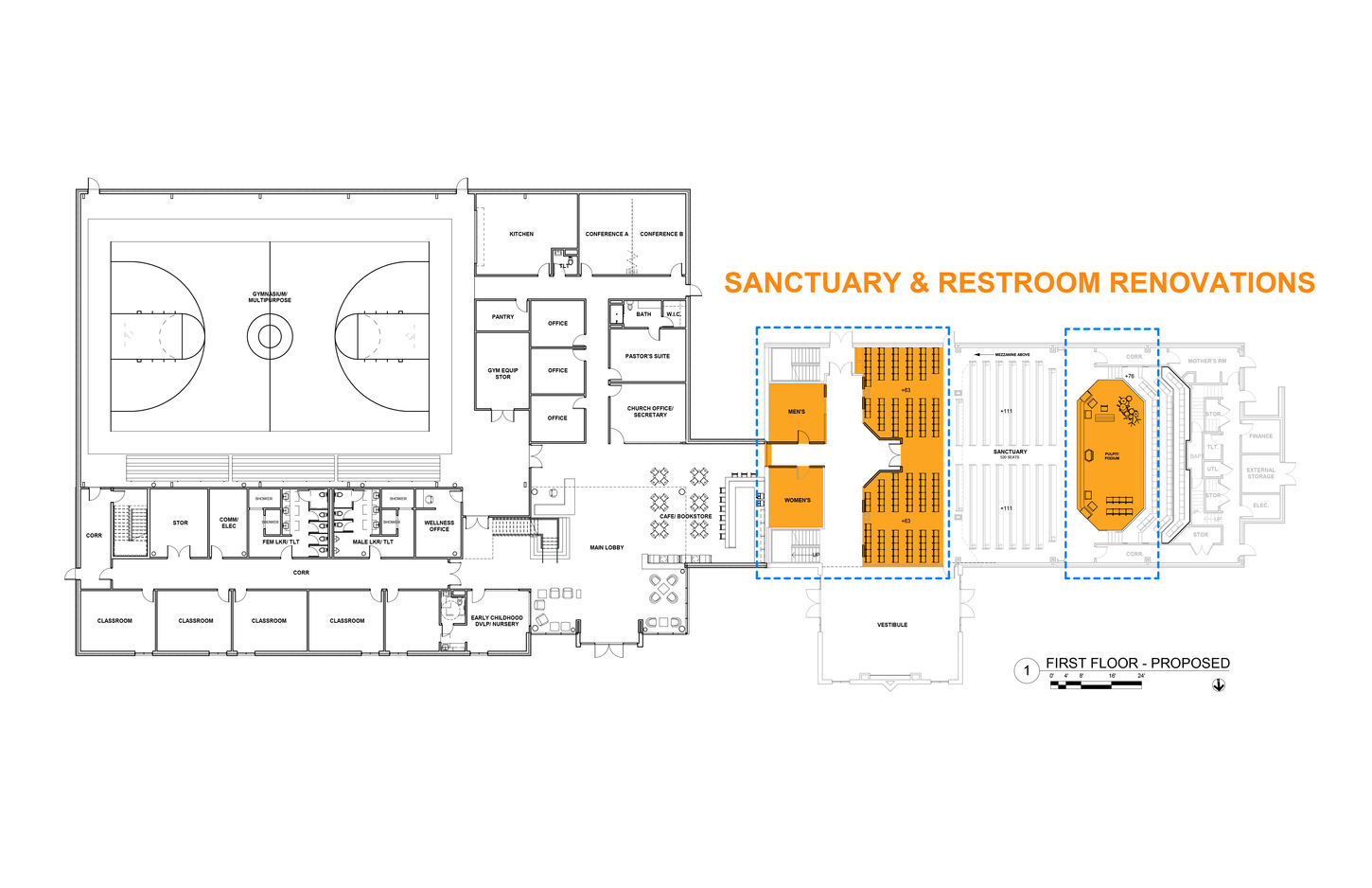 The Locust Ridge Primitive Baptist Church is planning for an expansion of its existing facilities, which includes a renovation of the sanctuary and addition of a new Family Life Center. The church renovation includes reconfiguration of the existing sanctuary and mezzanine level spaces to accommodate more seating, restroom facilities, and expansion of the musician's pit. The new Family Life Center will include a new gymnasium, new entrance lobby and cafe area, administrative offices, classrooms, and a commercial kitchen.